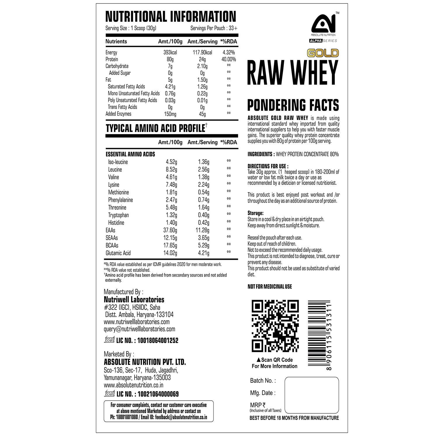 - Want a raw sports supplement that gives you ultra-premium results with no bullshit? Absolute Nutrition brings ‘Raw Whey’ which is an unflavoured raw protein formula with 80% whey protein concentrate. With a wholesome 24g protein, 4.55g BCAAs, 3.09g Glutamic Acid and 11.85g EAA’s per serving, Raw Whey by Absolute Nutrition is a one stop solution for the pro athlete who has that close connection with their bodies. Our Raw Whey is fortified with digestive enzymes and is highly recommended for professional athletes, sports enthusiasts and bodybuilders.